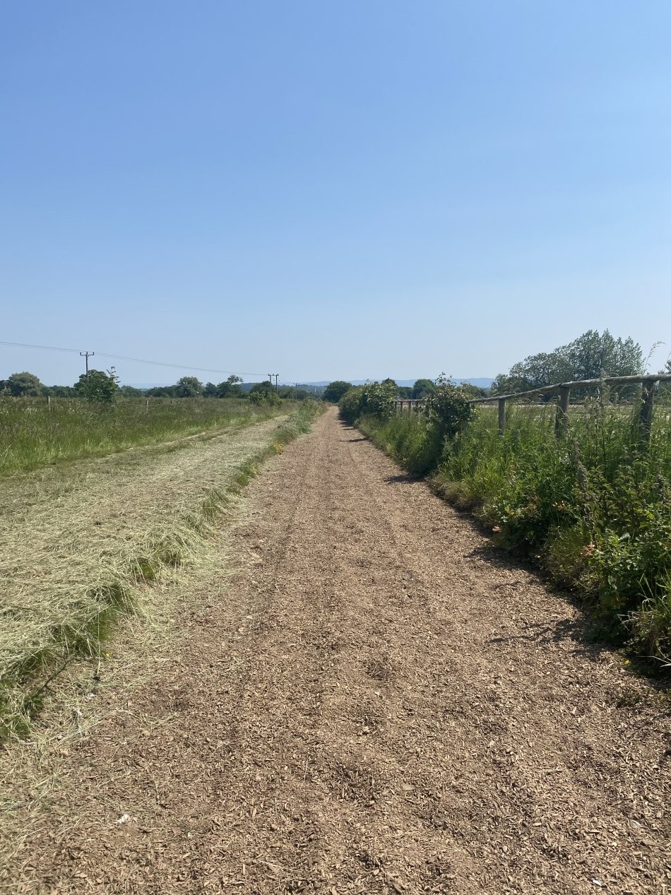 Opposite the main gate is the woodchip all weather gallop, recently topped up. This runs for 5½ furlongs with a gentle climb, on the collar for most of its length. This is a well proven gallop, good for general work. The yard's