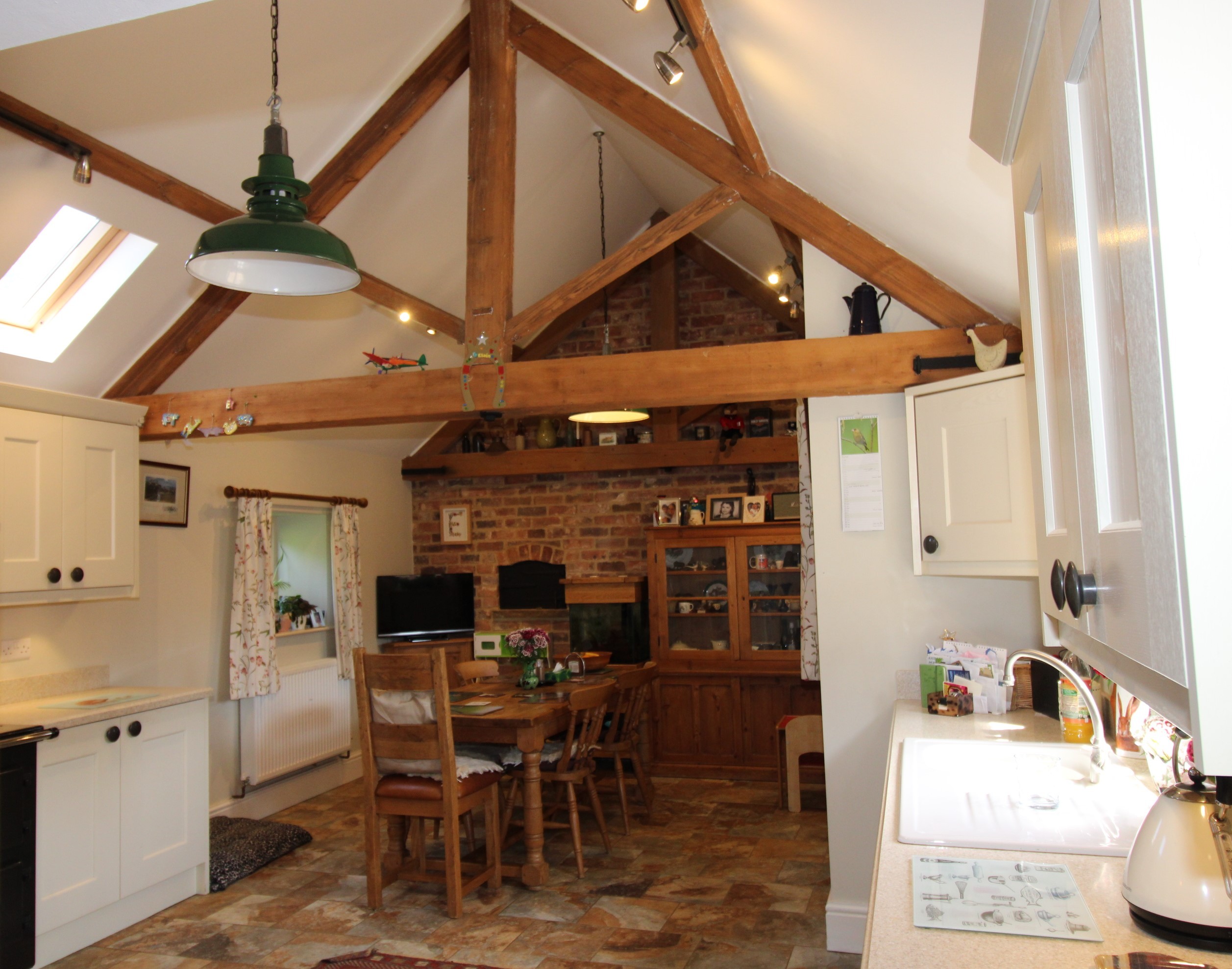 - Kitchen and dining area with part brick, part stone floor, base units, work surfaces, sink, timber ceiling beams, skylights and window to courtyard.