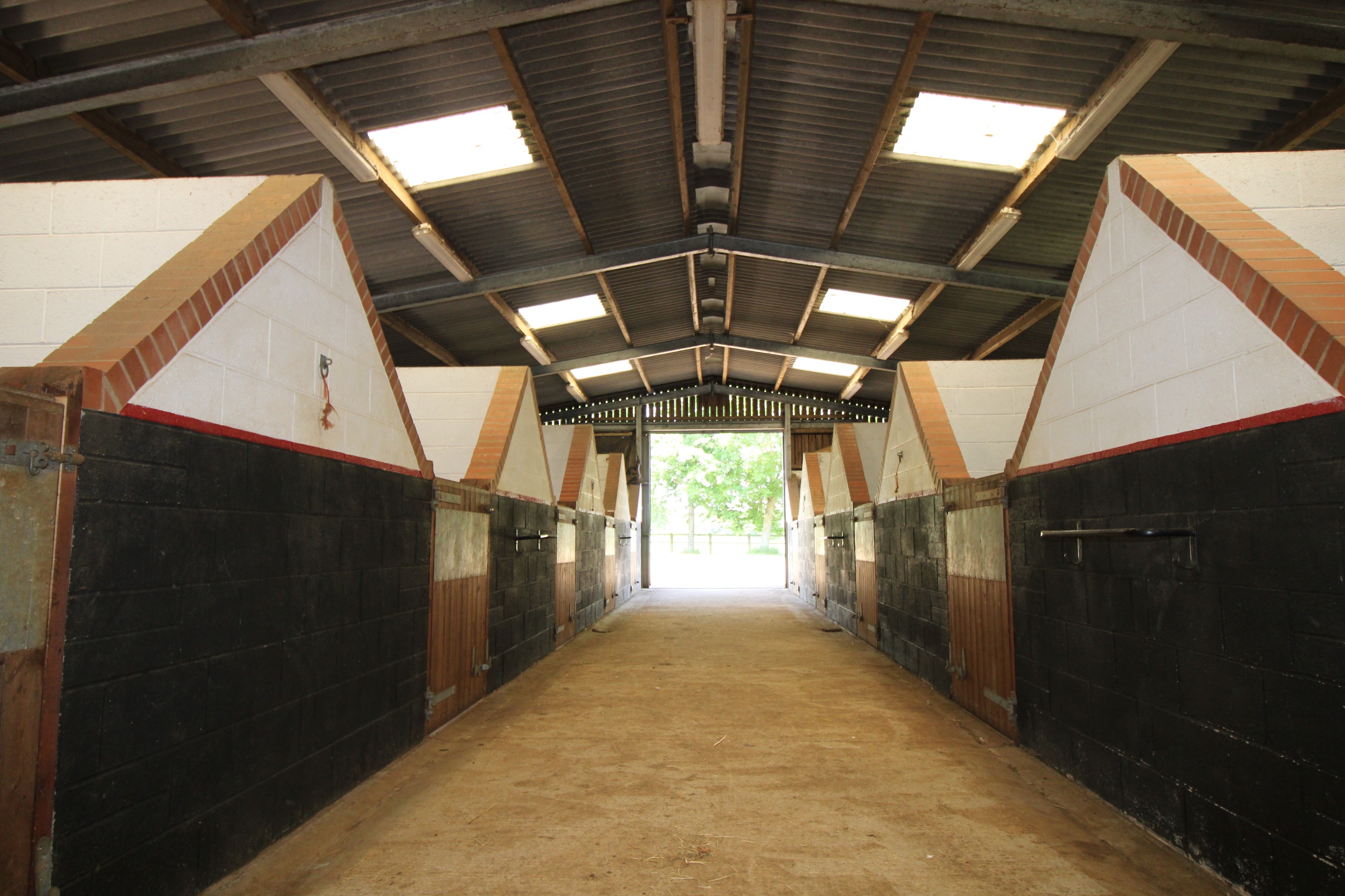 An American stable barn, approximately 90ft x 35ft, with 11 boxes plus separate foaling box, wash box and tack room with sink, WC and boiler. Steel frame, concrete floor, with corrugated fibre cement roof sheets and roof lights on timber purlins. Concrete block walling to front, sides and rear, clad in Yorkshire boarding. Sliding double doors at each end.